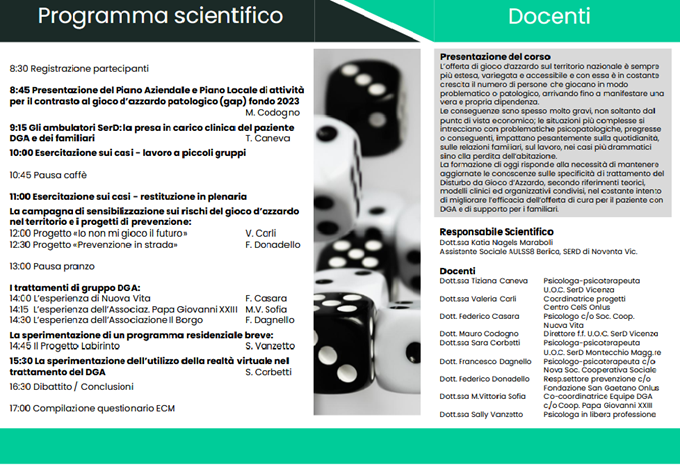 L’ evento formativo, organizzato durante il mese di prevenzione al Gioco d’Azzardo, è stato promosso dall’ Ulss n. 8 “Berica” e, oltre alla nostra cooperativa, ha visto la partecipazione di tutti gli enti (afferenti del pubblico e del privato sociale) che collaborano all’interno del Dipartimento del Gioco d’Azzardo.