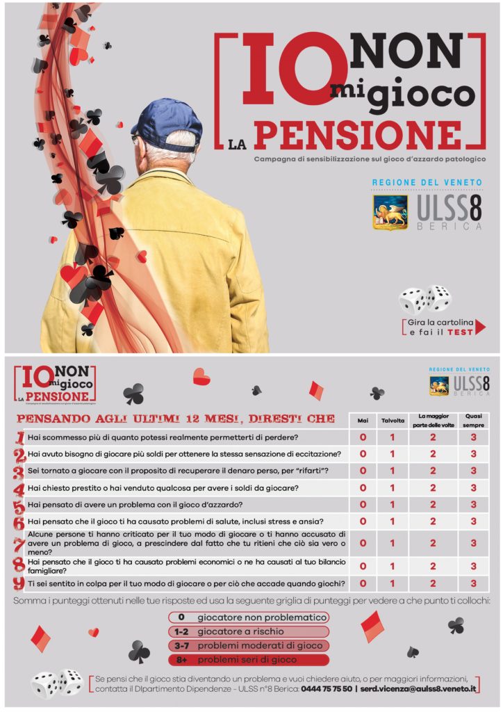 Da queste premesse hanno portato alla nascita del progetto “Io non mi gioco la pensione” , ideato all’interno del Dipartimento delle Dipendenze dell’ Aulss n. 8 fra operatori dell’ente pubblico Ser. D. Vicenza e del privato sociale: